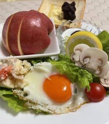 365日クッキング 1月18日の朝ごはん(水仙の花/白金台) 目玉焼き、マッシュルームとレタスのレモンサラダにプチトマト、ポテトサラダ、ヨーグルトとプルーン、りんご。 【365日cooking】調理時間...