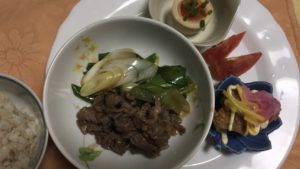 牛肉とニンニクの芽の炒め物、人参とじゃがいも(レッドムーン)のソテー、レタスサラダ、ふくだちの紅ショウガ和え、キムチ納豆。
