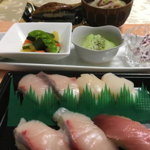 握り寿司(ヒラマサ、中トロ)、ズッキーニと根菜の煮物冷製とエンドウ、ブロッコリーのビネガー和え、千切り長芋の紫蘇和え、豚汁。