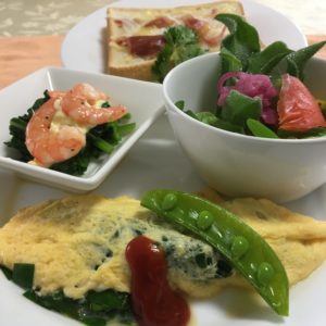 ニラのオムレツとエンドウ、ふくだちと海老の和え物、ルッコラとアイスプラントのサラダ、ベーコンチーズトースト。