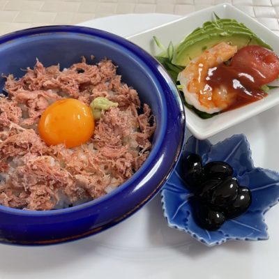 365日クッキング 5月4日のお昼ごはん(千駄木腰塚のコンビーフ丼、祇園ににぎのフルーツ大福) コンビーフ丼、アボカドと海老のカクテルにプチトマト、黒豆煮。千駄木腰塚のコンビーフを使用。 お食後のメレンゲ。 【365日cooking】調...