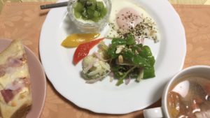 ベーコンピザトースト、ペイザンヌスープ、目玉焼きとパプリカのスイートピクルス、リーフレタスとコンキリエサラダ、ヨーグルトとキウイフルーツ。