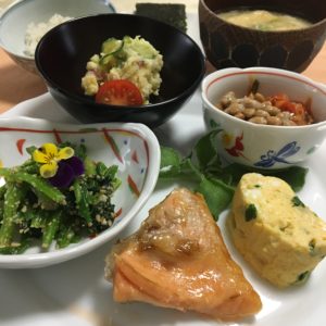 鮭のカマ焼とアイスプラント、ニラの卵焼き、ほうれん草の胡麻和え、ポテトサラダとプチトマト、キムチ納豆。