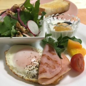 ハムエッグにプチトマトと人参、アイスプラント、ルッコラと胡桃のサラダ、ヨーグルトと冷凍柿。