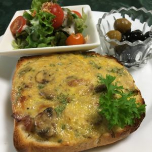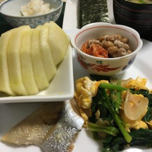 ほうれん草と卵のニンニク炒め、ベーコンチーズトースト、トマトとアイスプラント、甘夏みかん、ヨーグルトにシナモン。