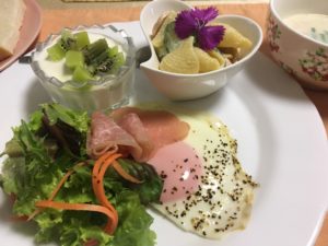 西京味噌のミルクポタージュ、目玉焼き(ベース・ド・エッグ)、レタスとピクルスのサラダに生ハム、コンキリエサラダ、ヨーグルトにキウイフルーツ。