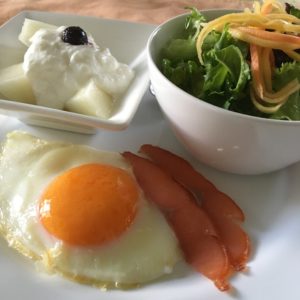 サニーサイドアップの目玉焼きとスモークサーモン、レタスとピクルスのサラダ、メロンとヨーグルト。