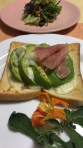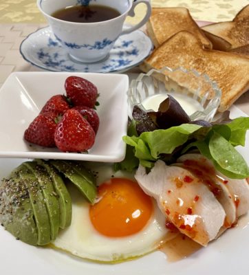 365日クッキング 4月15日の朝ごはん(ローストビーフとアイスプラント) ハムとチーズのホットサンド、目玉焼きとレタス、チキンのスイートチリソース、アボカドスライス、ヨーグルト、いちご。 【365日cooking】...