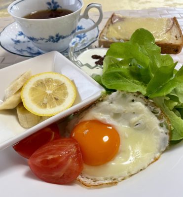365日クッキング 4月12日の朝ごはん(目玉焼きとバナナ) 目玉焼き、レタスとトマト、ハムチーズトースト、ヨーグルトとレーズン、バナナとレモン。 【365日cooking】調理時間は30分以内がサブコ...