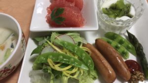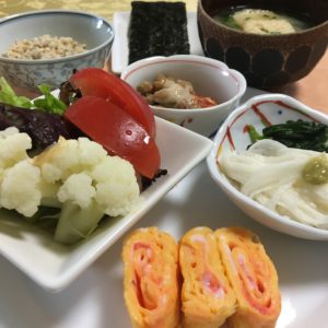 桜でんぶの玉子焼き、野菜サラダにカリフラワー、千切り長芋とほうれん草のお浸し、キムチ納豆。