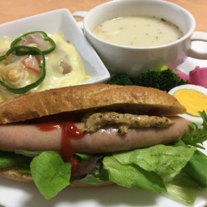 365日クッキング 12月22日の朝ごはん(ミニバゲットのソーセージサンド) ミニバゲットのソーセージサンド、根菜のチーズ焼き、ミルクポタージュ、塩たまごとブロッコリー、紫大根のピクルス。 【365日cooking】調...