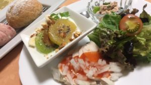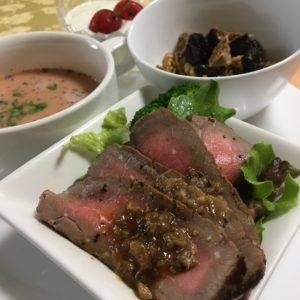 ローストビーフとトレタスのサラダ、ガスパチョ、シリアルに干し無花果とプルーン、ヨーグルトに佐藤錦。