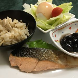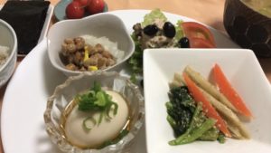 煮玉子、ほうれん草と根菜の胡麻和え、ツナとレタスのサラダに黒豆とトマト、玉葱納豆、佐藤錦。