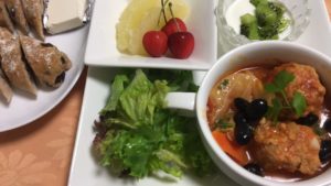 肉団子のトマトスープ、リーフサラダ、ヨーグルトとキウイフルーツ、グレープフルーツと佐藤錦。