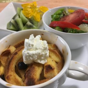 パン耳プディング、グレープフルーツと野菜のサラダ、キウイフルーツにエディブルフラワー。
