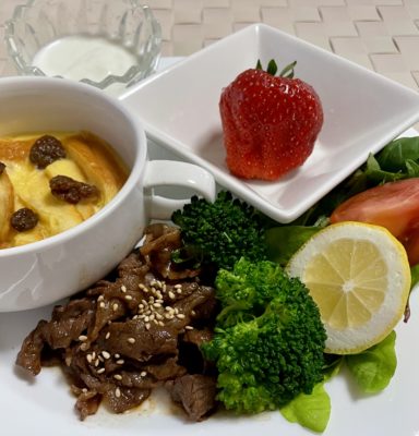 365日クッキング 4月17日の朝ごはん(パン耳プディング、コーヒーMIKIの天井落としカフェ・オ・レ) パン耳プディング、牛肉の焼しゃぶ、野菜サラダ、ブロッコリーとレモン、ヨーグルト、いちご。 【365日cooking】調理時間は30分以内がサ...