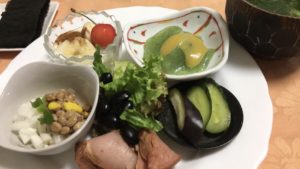 ローストビーフサラダ、レタスのサラダに黒豆、自家製胡瓜と茄子のぬか漬け、刺身こんにゃくに酢味噌、玉葱納豆、ヨーグルトにバナナと佐藤錦。