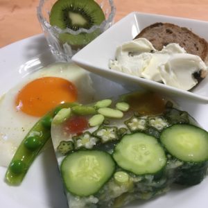 夏野菜のゼリー、目玉焼きにエンドウ、キウイフルーツ。