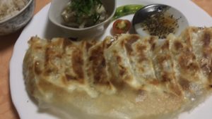 羽根付き餃子にプチトマトとエンドウ、しめじのおろし和え。