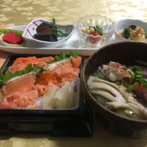 サーモンのちらし寿司、豚汁、コーンとインゲンの和え物にプチトマト、野菜のうま煮、黒胡麻豆腐、紅大根のピクルスとエンドウ。