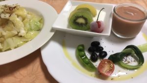 キャベツのペペロンチーノパスタ、ンゲンと黒豆とトマトに小松菜のレモンバターソース、ガスパチョ、ヨーグルトにキウイフルーツと冷凍佐藤錦。