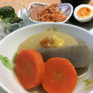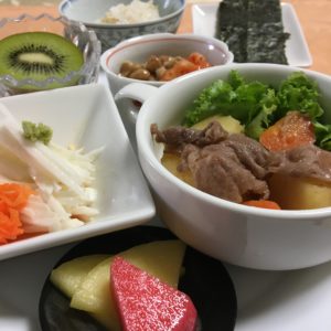 肉じゃが、千切り長芋とキャロットラペ、キムチ納豆、紅大根のピクルスと自家製沢庵の浅漬け、キウイフルーツ。