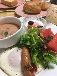 目玉焼き、ソーセージにレタスとすいか、ガスパチョ、ヨーグルトとブラックベリーにシリアル。