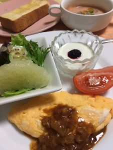 オムレツとトマト、ガスパチョ、レタスとグレープフルーツのマスタードドレッシングサラダ、ヨーグルトとブラックベリー。