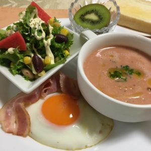 ベーコンエッグ、ガスパチョ、豆とレタスとコーンのサラダ。