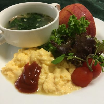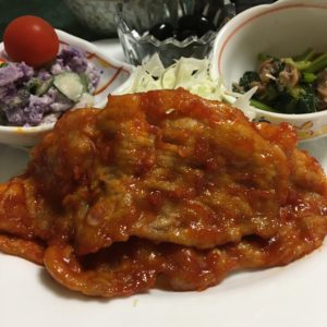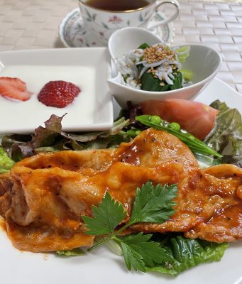 365日クッキング 5月23日の朝ごはん(りんごパンとチキンサラダ、ネギと人参の卵炒め) ポークチャップ、野菜サラダとトマトにエンドウ、小松菜のシラス和え、ヨーグルトといちご。 【365日cooking】調理時間は30分以内がサブ...