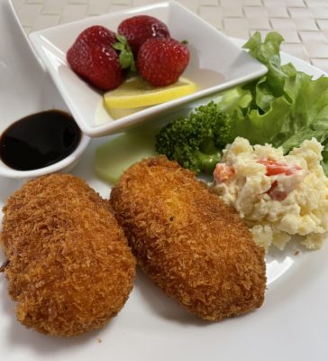 365日クッキング 1月14日のお昼ごはん(雪と青空) 蟹クリームコロッケ、ポテトサラダと小松菜レタスにブロッコリー、いちごとレモン。 【365日cooking】調理時間30分以内がサブコンセプト...