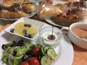 調理パンとスイーツパン、ガスパチョ、マスタードドレッシングサラダ、グレープフルーツに冷凍ブルーベリー、ヨーグルトに冷凍佐藤錦。