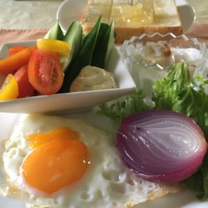 目玉焼きとレタス、紫ペコロスのピクルス、バーニャカウダ、ヨーグルトにバナナ。