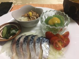 しめ鯖にオニオンスライスとプチトマト、刺身こんにゃくに酢味噌、自家製胡瓜のぬか漬け、玉葱納豆。