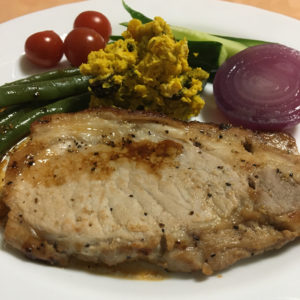 ポークソテーとインゲンのソテー、パンプキンサラダに紫ペコロスのピクルス、胡瓜とプチトマト。