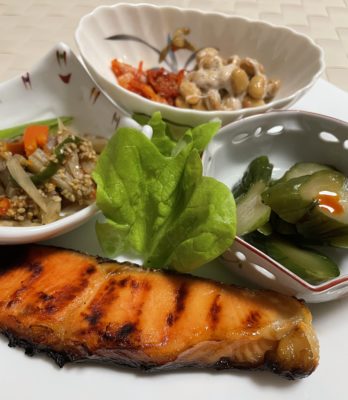 365日クッキング 3月20日の晩ごはん(桜鯛のにぎり寿司) 銀鮭の西京味噌焼とレタス、金平ごぼう、キムチ納豆、胡瓜のラー油醤油漬。こんがりと焼けているように見える鮭であるが焦げている。悔しい思いをした...