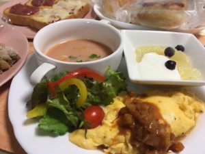 ピザトースト、オムレツとプチトマトにレタスとパプリカのサラダ、ガスパチョ、ヨーグルトとグレープフルーツにブルーベリー。