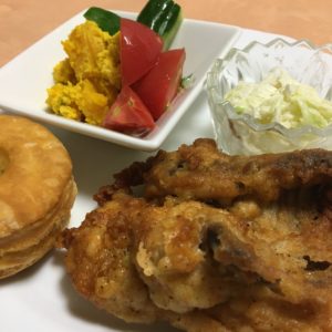 ケンタッキーフライドチキン、ビスケット、パンプキンサラダに胡瓜とプチトマト、コールスロー。