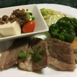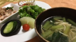 冷たい豚しゃぶの梅しそ和え、酢の物、レタスとグレープフルーツのサラダにプチトマト、自家製胡瓜のぬか漬け。