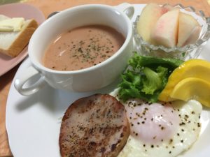 ハムのソテーと目玉焼き、レタスとコリンキーのピクルス、ガスパチョ、桃。