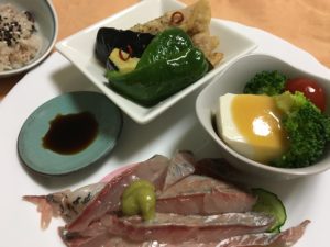 鯵の刺身、豆腐とブロッコリーの酢味噌がけにプチトマト、揚げ豚と揚げ野菜の南蛮漬け。