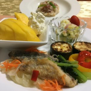鯵のエスカベッシュと野菜のソテーに小松菜のお浸し、ポテトサラダとプチトマト、リゾット、パパイヤのクリーム添え。