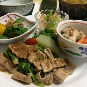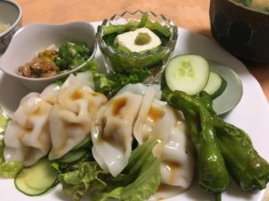 海老の水餃子にグリーンサラダと揚げシシトウ、冷や奴と小松菜のお浸し、ねぎ納豆、自家製胡瓜のぬか漬け。