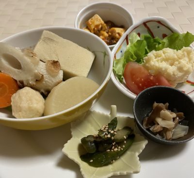 365日クッキング 4月22日の晩ごはん(おでんとポテトサラダ) おでん、麻婆豆腐、ポテトサラダにレタスとトマト、きのこの和え物、胡瓜の中華風。 【365日cooking】調理時間は30分以内がサブコンセプ...