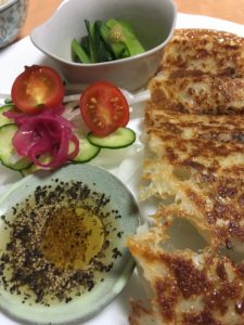 焼き餃子、オニオンスライスと紫玉葱のピクルス、胡瓜とプチトマト、小松菜のお浸し。