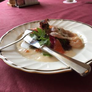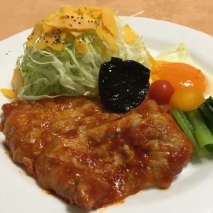 ポークソテーとプチトマト、レタスとパンプキンサラダ、プルーン。