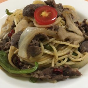 牛肉と舞茸のペペロンチーノパスタ。