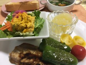 鰯のバルサミコソースとピーマンのソテー、春菊入り野菜のコンソメスープ、パンプキンサラダ、グレープフルーツ。