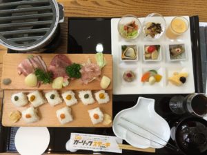 北釧鰯の酢締め握り寿司、焼き海老、レタスと黒豆のサラダ、黒胡麻豆腐。