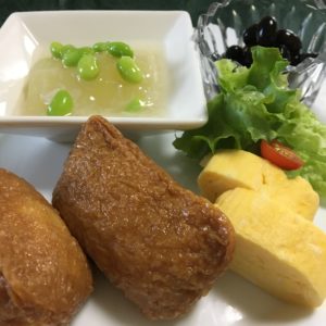 いなり寿司、だし巻き玉子とレタスにプチトマト、冬瓜の帆立葛餡掛け、黒豆の甘煮。